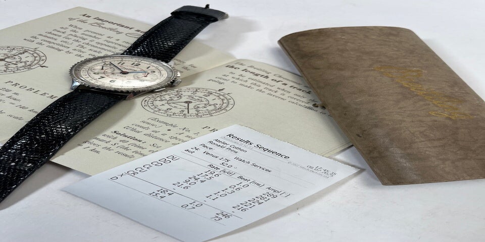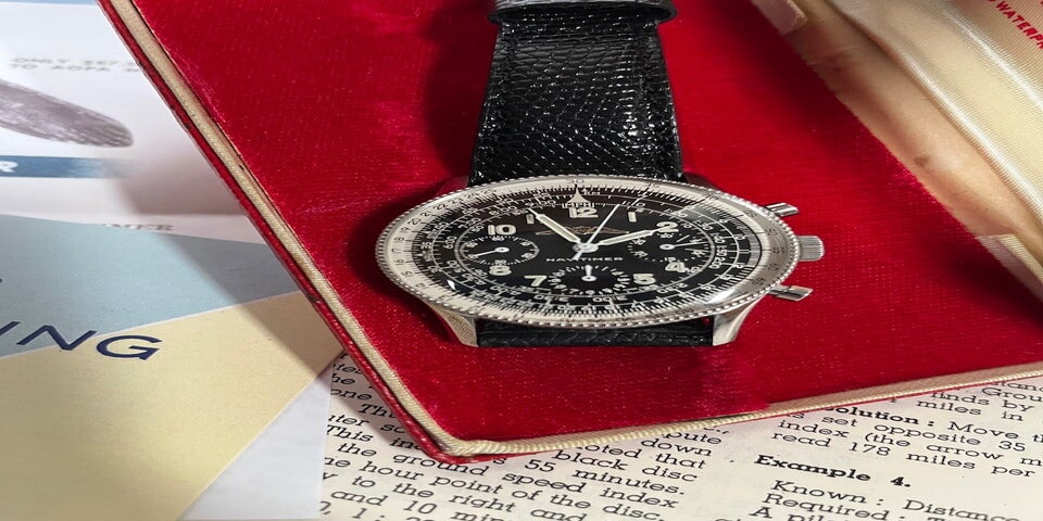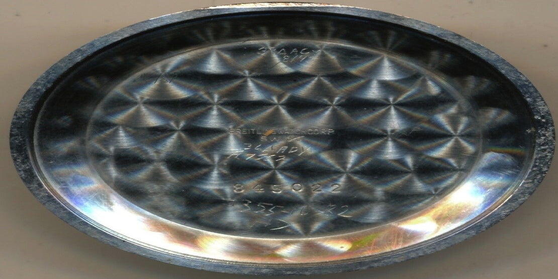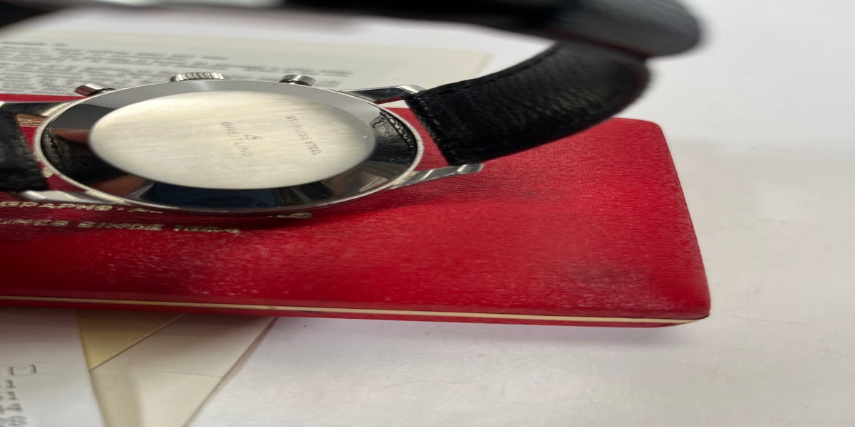 The steel bezel turns smoothly and has well-defined notches. It measures 37mm. The case, pusher, and B-crown are made of steel (the B-crown is a bit worn). The case may have been lightly serviced, according to the previous owner (2014). The back bears the reference number 769 and the unique serial number. The movement is signed but does not have a US import code, so it may have originally been supplied in Europe (although not all US import watches received a code at the time). The dial and hands are completely original and correct. The beautiful dial is fantastically preserved and has minimal patina with only two notable signs of age (mainly around the hand in the left register and next to the 1). The beautiful Breitling box was acquired some time later in America but could be European. The watch also comes with a very early instruction booklet (according to the seller, the original paperwork was obtained in 2014).