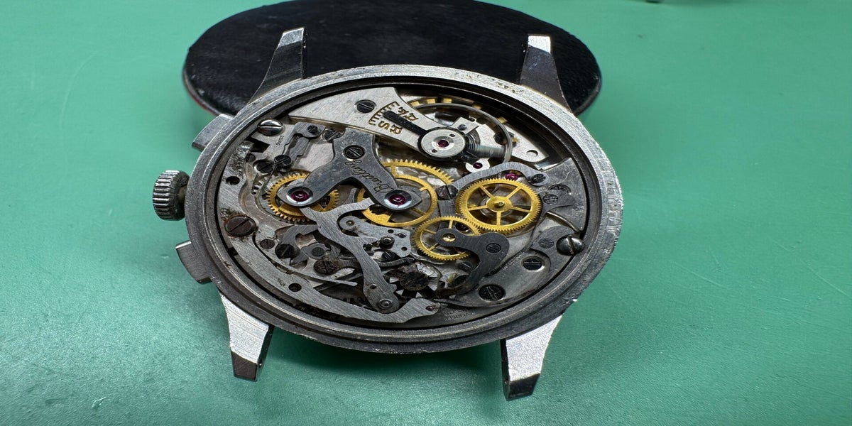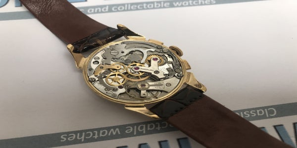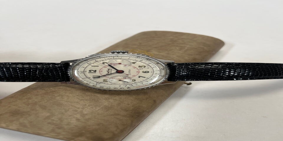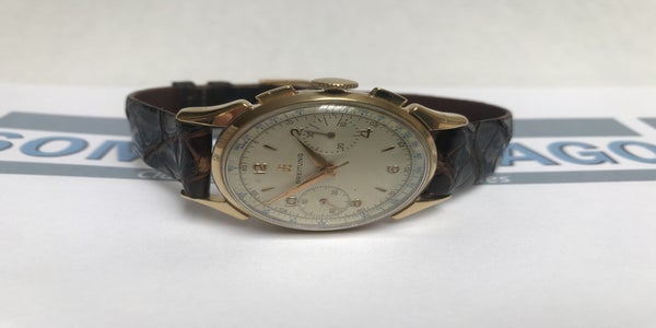 This is a classic, approximately 70 years old, that deserves to be worn and seen. The current owner and collector has kept the sales information from 2014, which is also included, along with the printout from the watchmaker, who also took photos of the movement and the caseback. The included printout shows that the movement is running accurately. The chronograph and regular time display also work properly. The watch was worn only once after its purchase in 2014. For questions, additional photos, or details, please feel free to contact me.