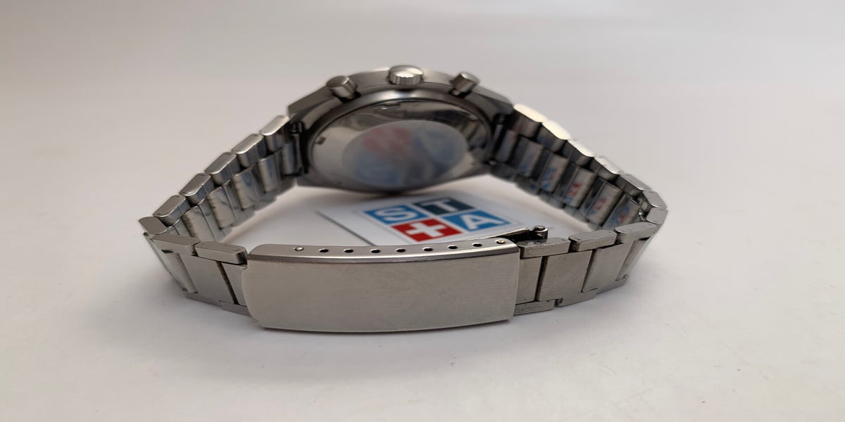 This is a rare Chronograph with unusual layout as also found in several Heuer from the late 1970's. This Dugena is a like a brother form another mother. The Valjoux 7765 manual winding 17 jewel movement dictates the layout. Even the case is very similar. Small difference are in the exact dial details. But hands are again very similar. The case is a satin finished beat blasted steel as is the original unsigned bracelet. This watch was made in a very small batch for the 25 year anniversary of a Germany Company called EBV as seen on the back case. The movement is clean and functioning flawless, resets perfect to 12. The case measures 41mm without original crown and pushers. The bracelet will fit a wrist op to 20mm. The glass crystal is scratch free but there are small signs of use around the edge of the dial and on the bracelet. These are to be expected on a real tool watch from ca. 1980 and does it justice. It come in a periode correct Dugena box, no papers, no worries.