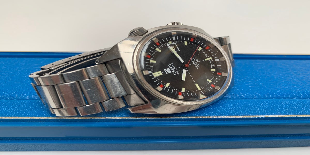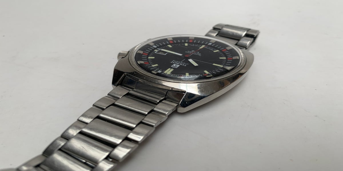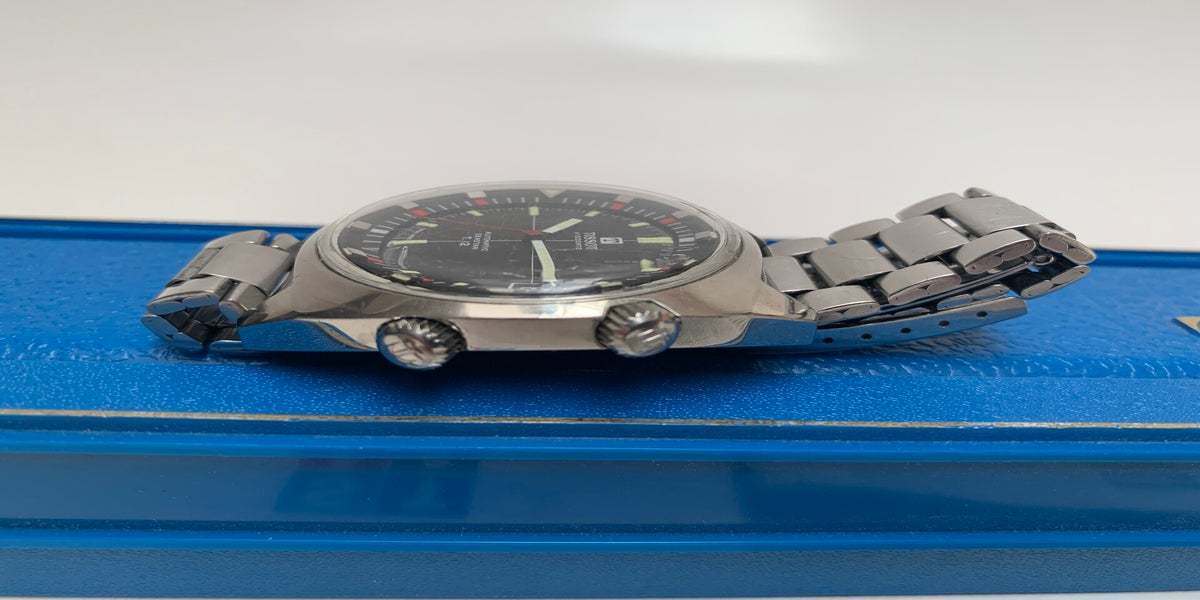 Beautiful large T-12 case diver by Tissot from the late1970's. Comes with the original stainless steel G&F-bracelet, box and grantee certificate. Also comes with a new black leather strap with Tissot buckle and extra black nato strap. Dial and rotating bezel are in great shape and hands are freshly painted to match (second hand made red instead orange to match dial...something that Tissot should have done in the first place. Thick plastic crystal is still original but has some stress marks (only visible from certain angles...tried to show this in pictures).