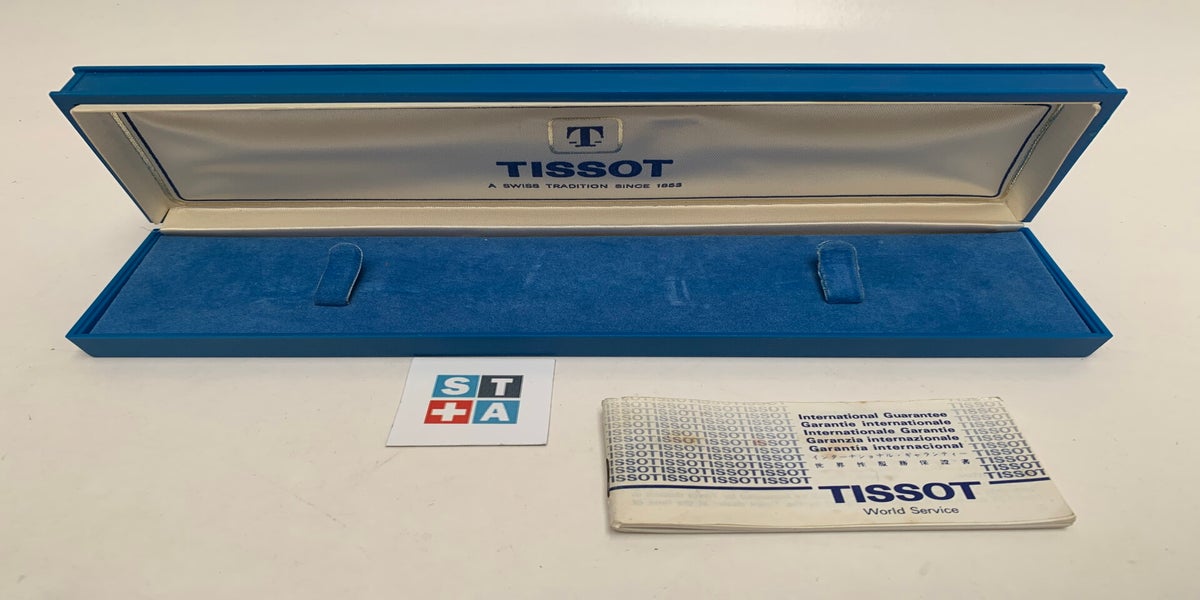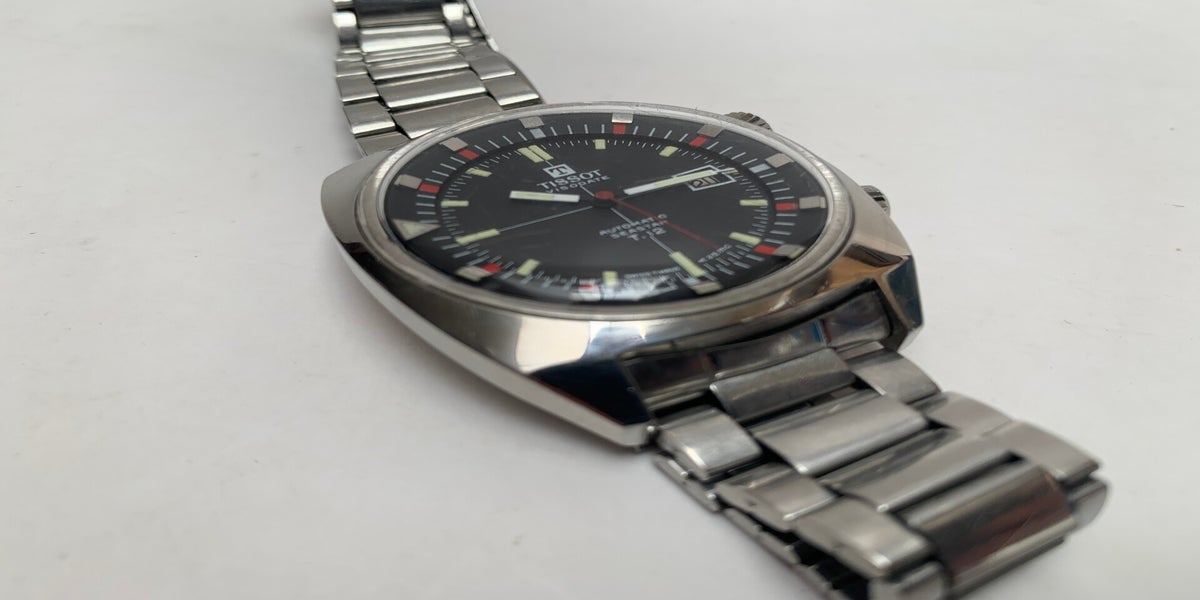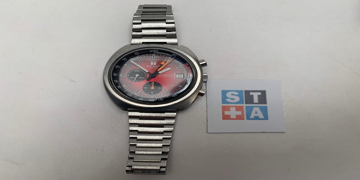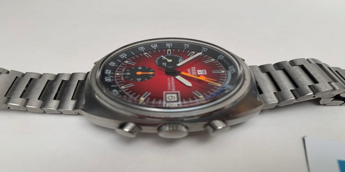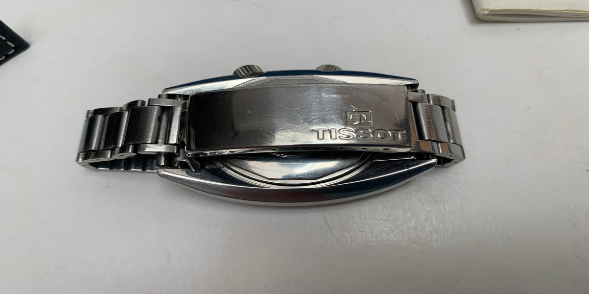 All original with some aging to the dial. All complete and working like it should with the chronograph hands coming back to zero with a push of the button. Great tonneau all stainless steel case and back, signed crown. No box, no papers. New rubber strap with racing holes, orange stitches and matching (later) Tissot signed stainless steel buckle.