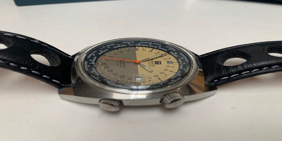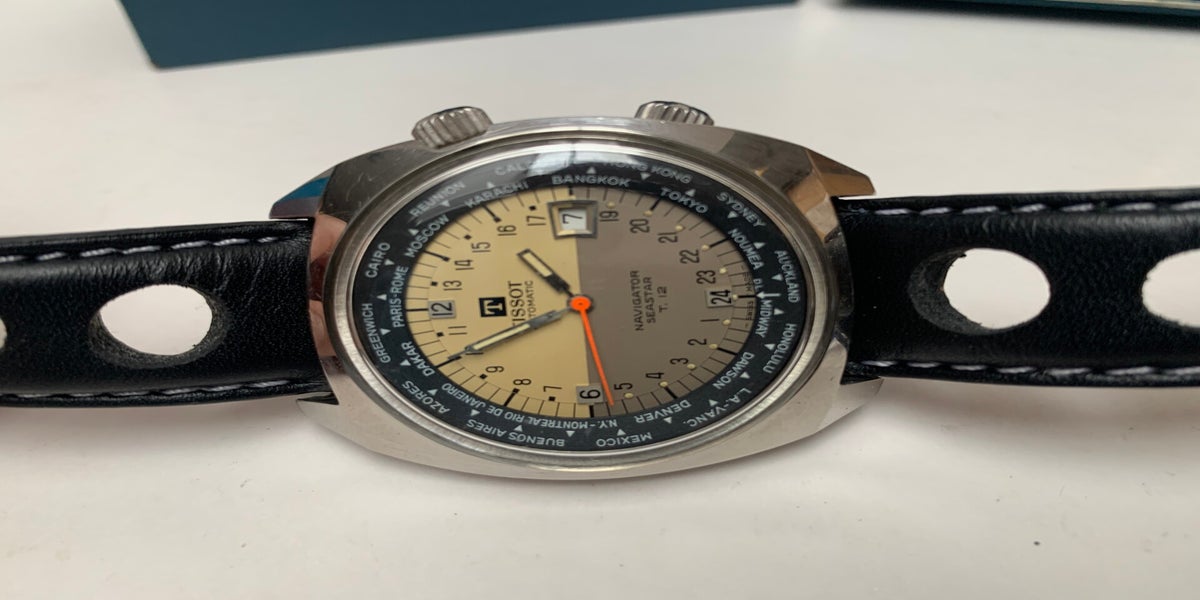 This is the beautiful split dial Tissot Navigator Seastar T-12 automatic with 24 hour dial and movement where the hands go round once every 24 hours. The second crown rotated the inner World Time bezel, providing a second time zone!